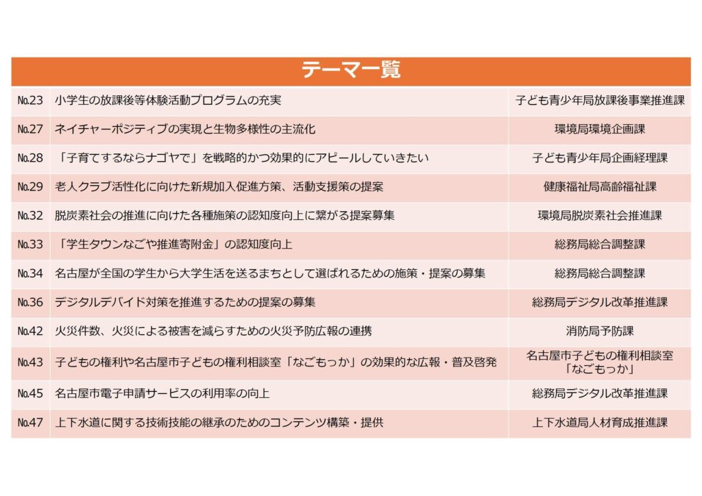 名古屋市では、公民連携推進施策「ナゴヤフロンティア」において民間企業等の皆様へテーマ(行政課題・社会課題)を示し、そのテーマに対する効果的な解決策を民間企業等の皆様独自の視点でご提案いただく制度(「テーマ型提案制度」)を導入しています。